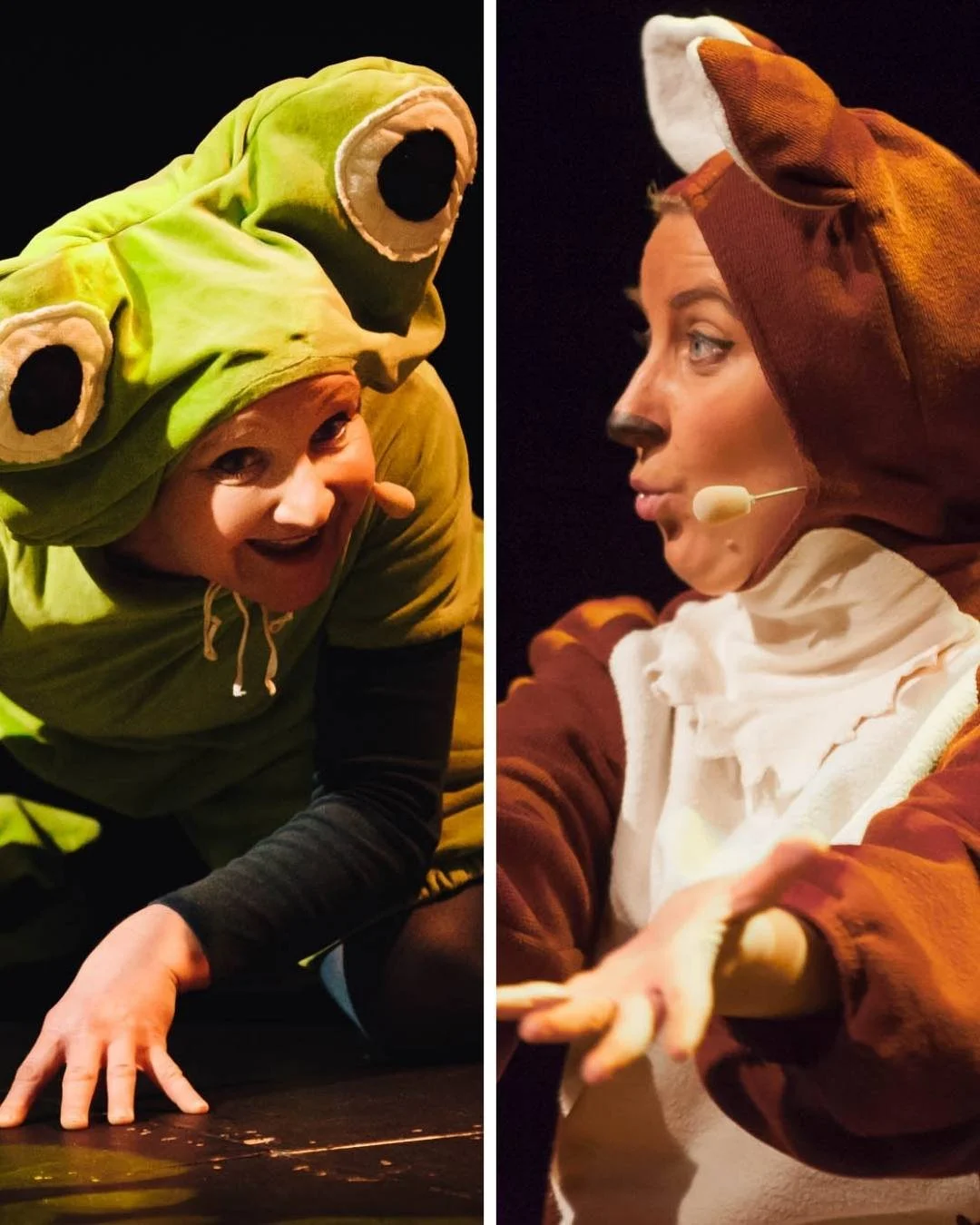 Siina Hirvonen ja Sari Kallioranta seikkailevat Piilometsän kesäkisat -konsertin kettuna ja sammakkona.